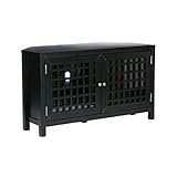 Tucked neatly into any corner, this beautiful media stand adeptly collects and contains electronic clutter, leaving living spaces enjoyable, relaxing, and perpetually tidy. The unit's rich, painted-black finish provides a fitting display for flat-screen televisions up to 42 inches, while its post-style legs and well-tailored lines lend it a sense of sturdy splendor. Equipped with contemporary gridded windowpanes, the unit's double doors open to reveal two adjustable shelves with considerable space for DVD players, gaming systems, stereo equipment, CDs, and other electronic devices. Even more, a convenient cutout in its back paneling allows for easy management of electrical cords. Deeply recessed side panels and pewter hardware complete the handsome corner media stand, which requires some assembly and measures 19-3/4 inches deep by 42 inches wide by 24 inches tall.