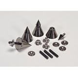 By rigidly coupling a loudspeaker enclosure to a floor by means of a "spiking" system, it is possible to dramatically improve clarity, stereo imaging and bass response.This is very apparent with subwoofer systems.These attractive spikes are precision machined from solid brass and then plated with a durable black chrome finish.Each cone spike weighs 86 grams and measures 1-1/4" diameter and 1-1/2" tall.The two piece threaded tip design allows for precise level adjustment.Barbed insert nuts and threaded studs are included for mounting in cabinets with walls up to 1" thick.Set includes 4 black chrome cone spikes, 4 black chrome floor discs, 4 insert nuts and 4 threaded studs. Threads are M6.
